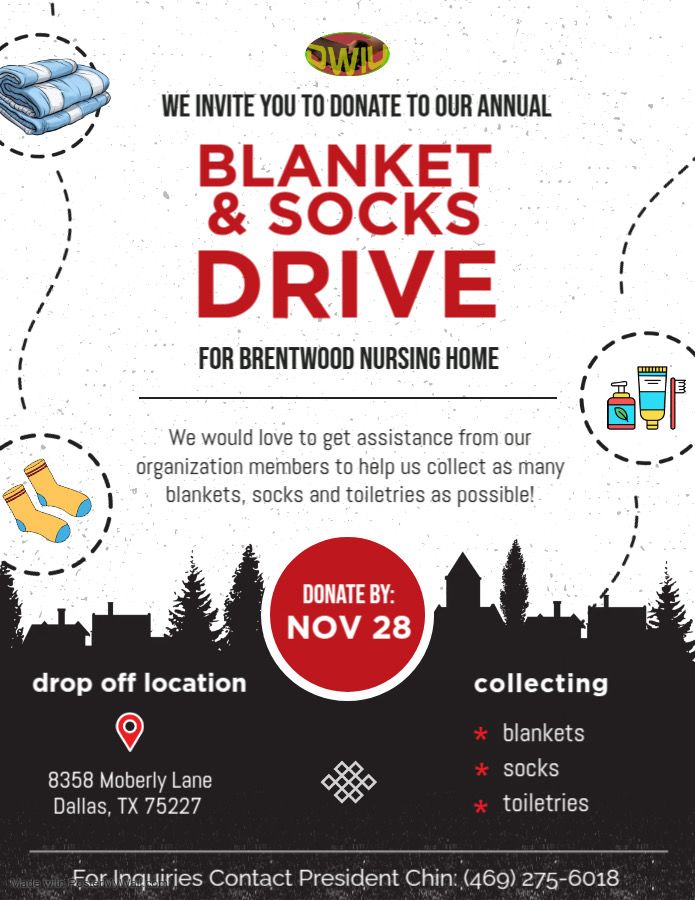Join us for our annual Blanket & Socks Drive as we collect donations for the residents of Brentwood Nursing Home. We’re asking all organization members and supporters to help by donating blankets, socks, and toiletries. Every contribution makes a difference in keeping our seniors warm and comfortable this season.