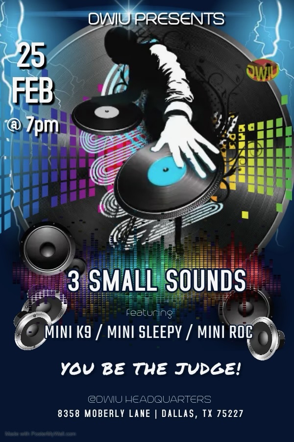 Four different sounds will be in the building; house rules are 2 over 2 definitions! Two tops over two subs. The theme is Quality, Clarity, and Sportsmanship.WINNER TAKES ALL!!